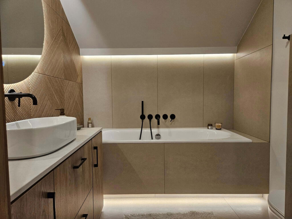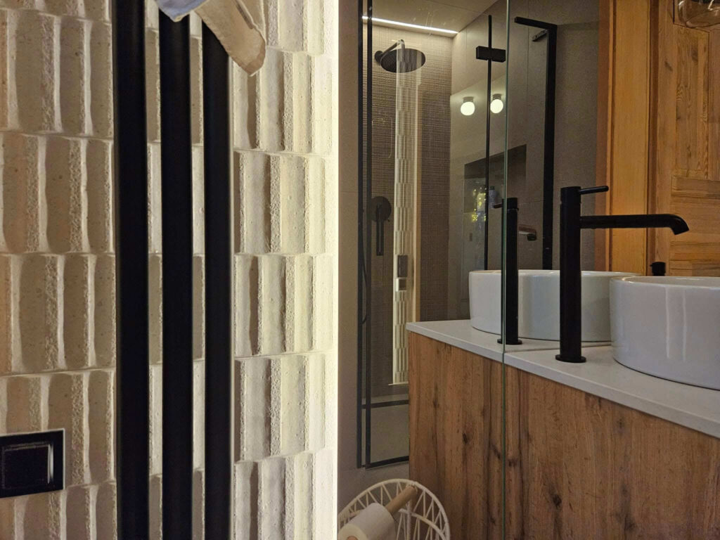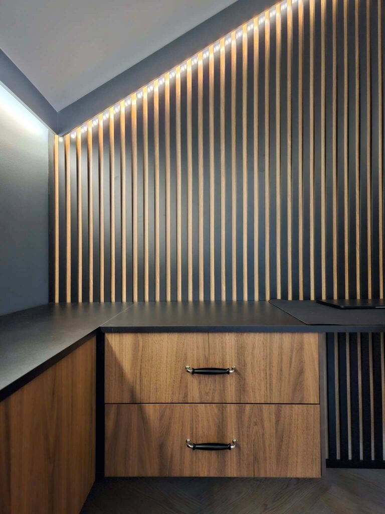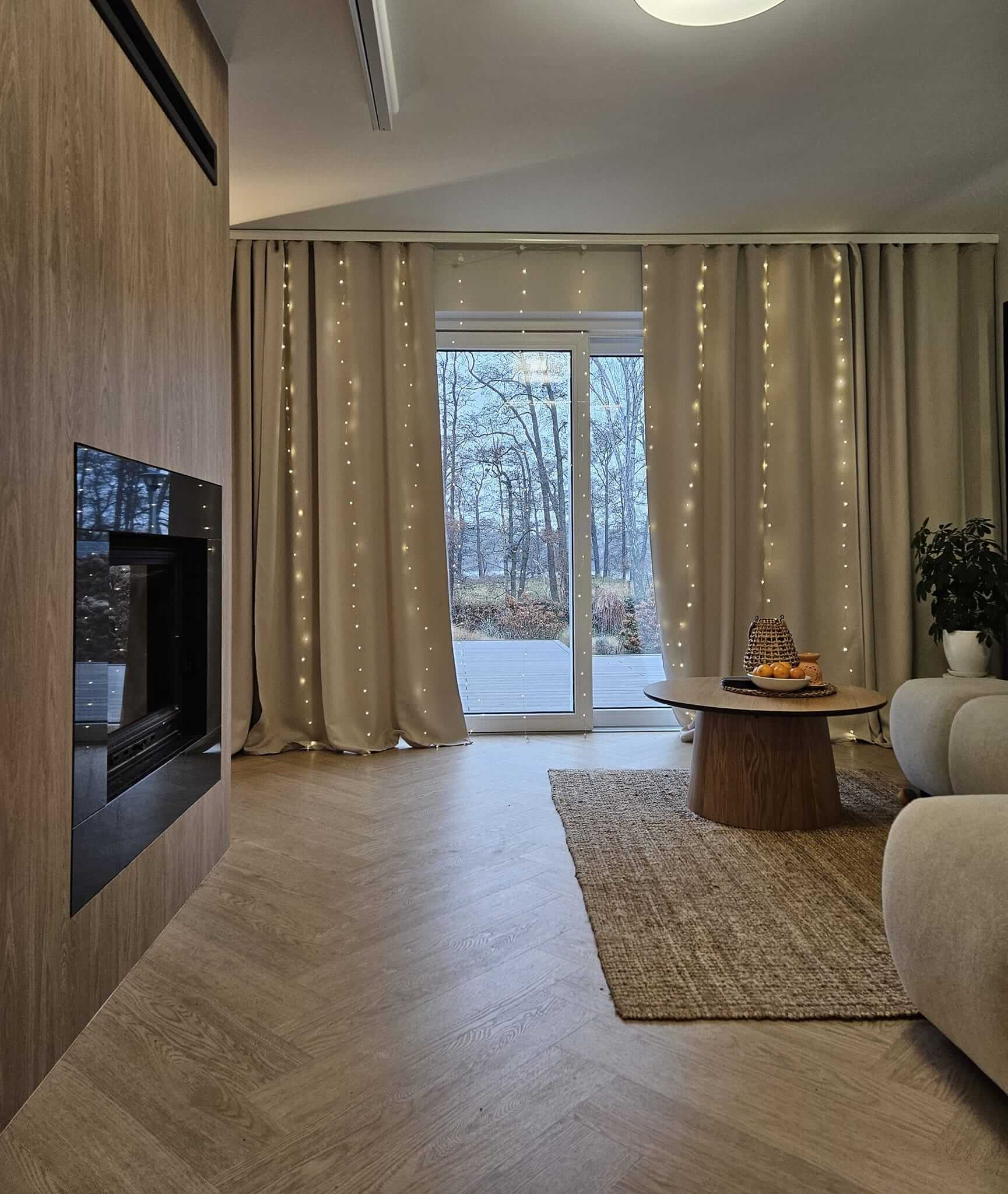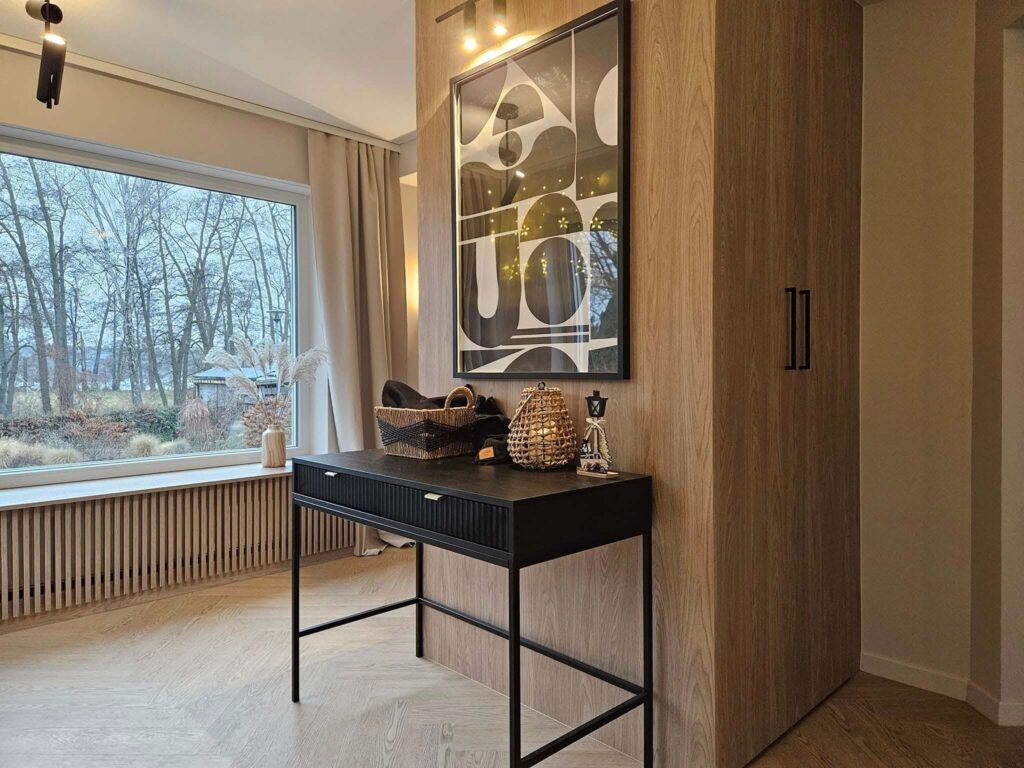 Centralnym punktem aranżacji parteru stała się zabudowa stolarska zaprojektowana wokół kominka – całość tworzy jedną bryłę w formie prostopadłościanu. Funkcjonalna zabudowa mieści garderobę wierzchnią, szafę gospodarczą oraz praktyczną wnękę na drewno opałowe. Całość została wykończona dębowymi panelami, które dodają wnętrzu ciepła i elegancji.