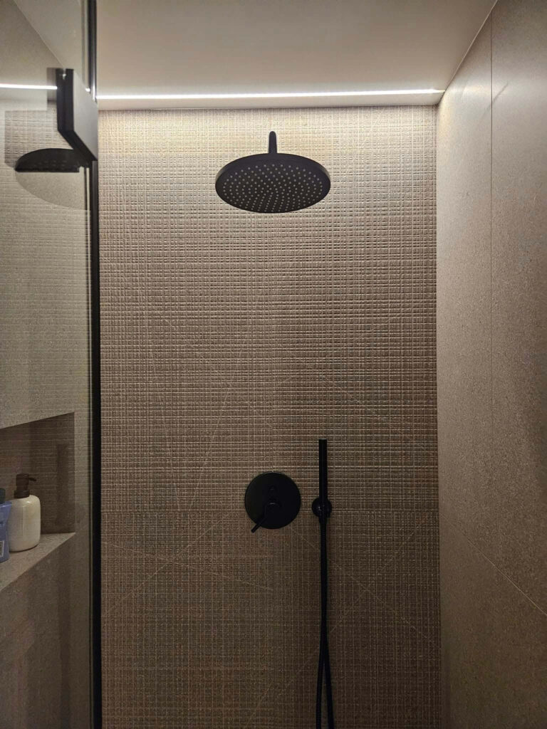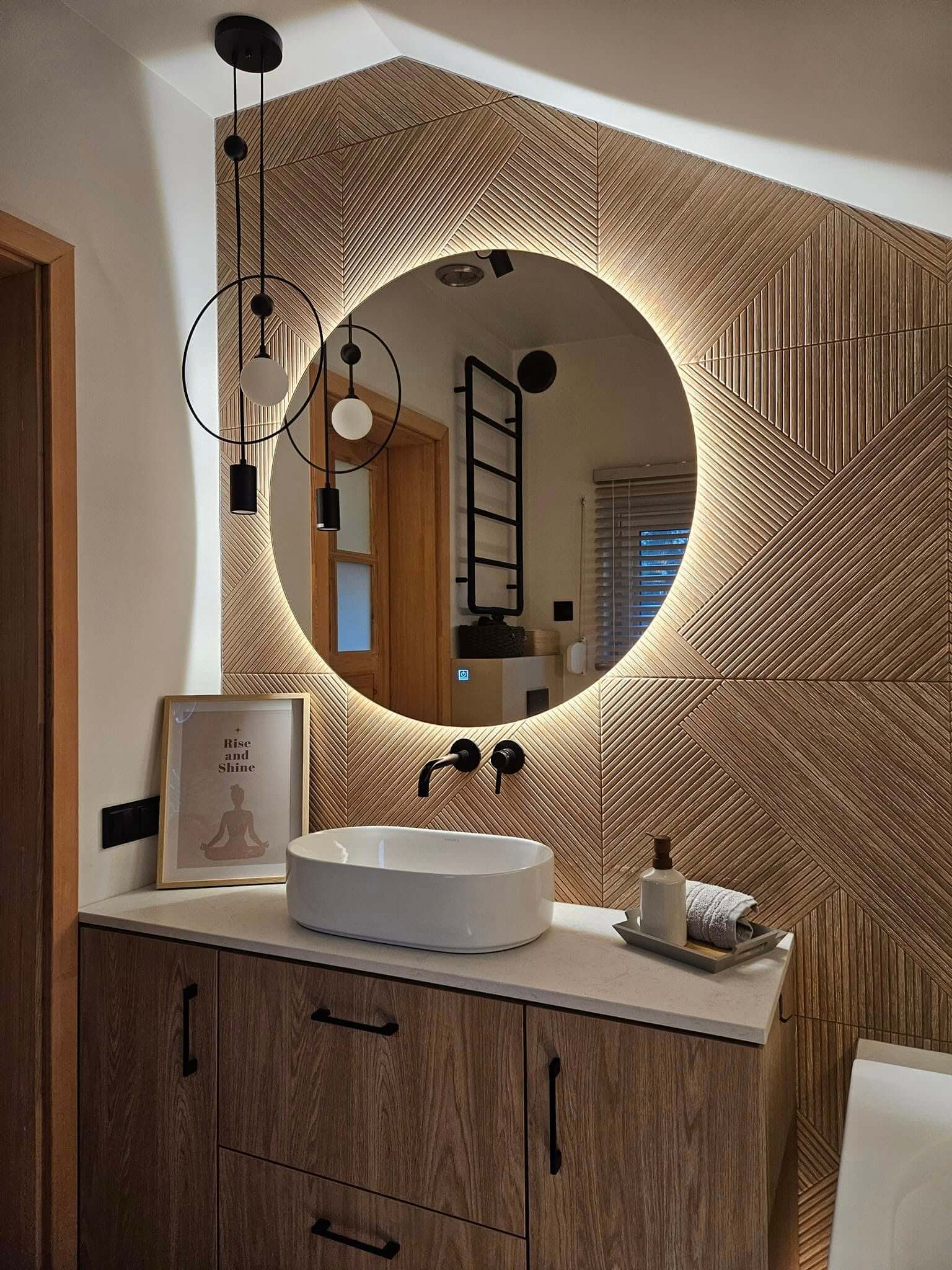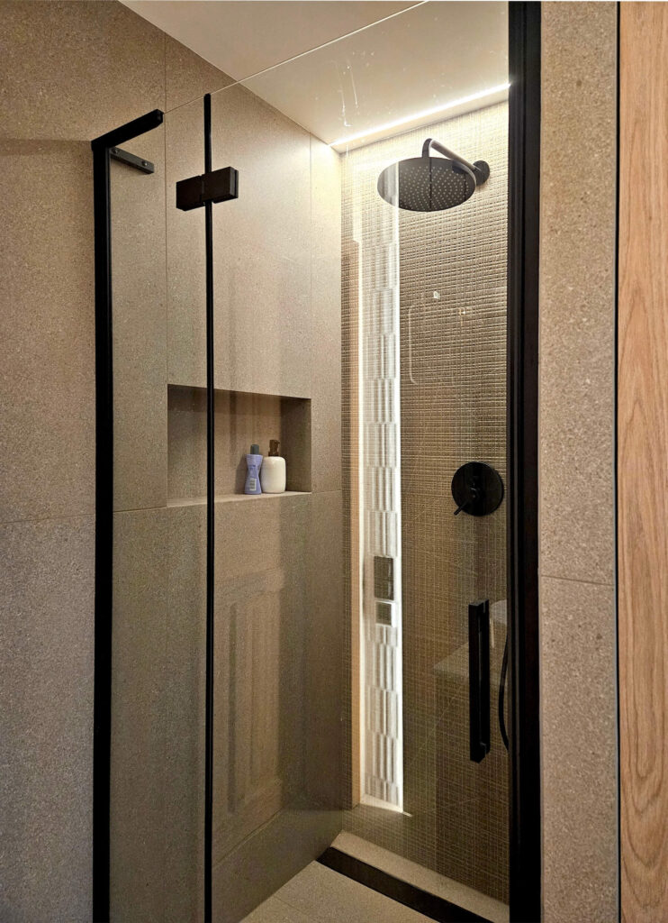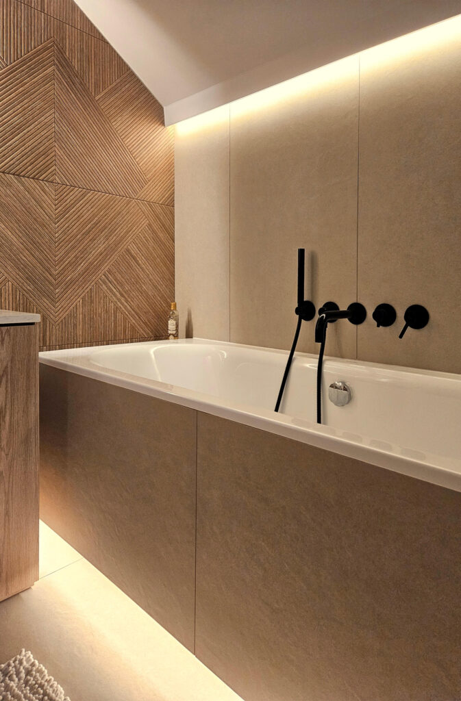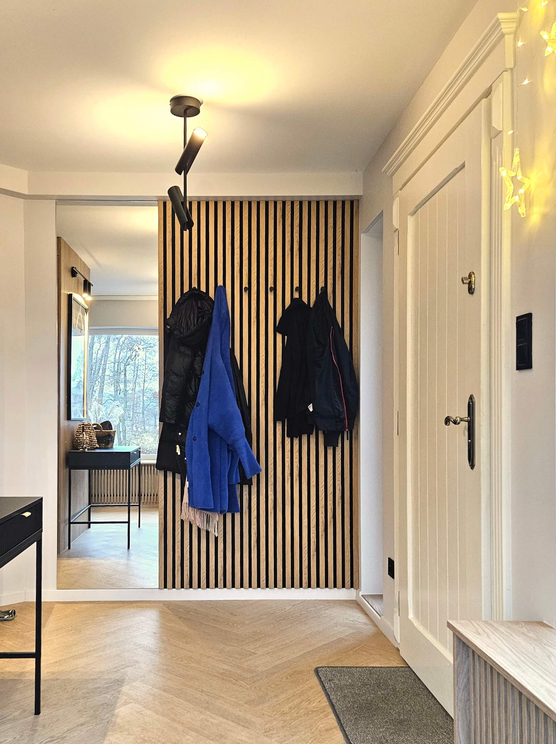 Centralnym punktem aranżacji parteru stała się zabudowa stolarska zaprojektowana wokół kominka – całość tworzy jedną bryłę w formie prostopadłościanu. Funkcjonalna zabudowa mieści garderobę wierzchnią, szafę gospodarczą oraz praktyczną wnękę na drewno opałowe. Całość została wykończona dębowymi panelami, które dodają wnętrzu ciepła i elegancji.