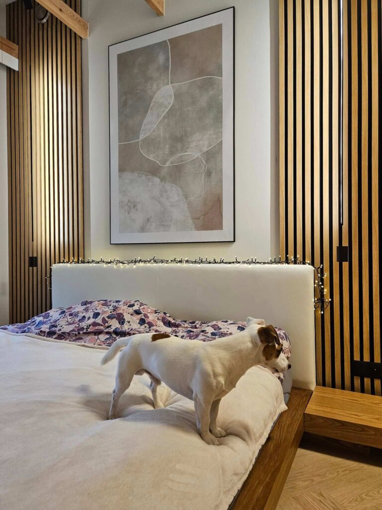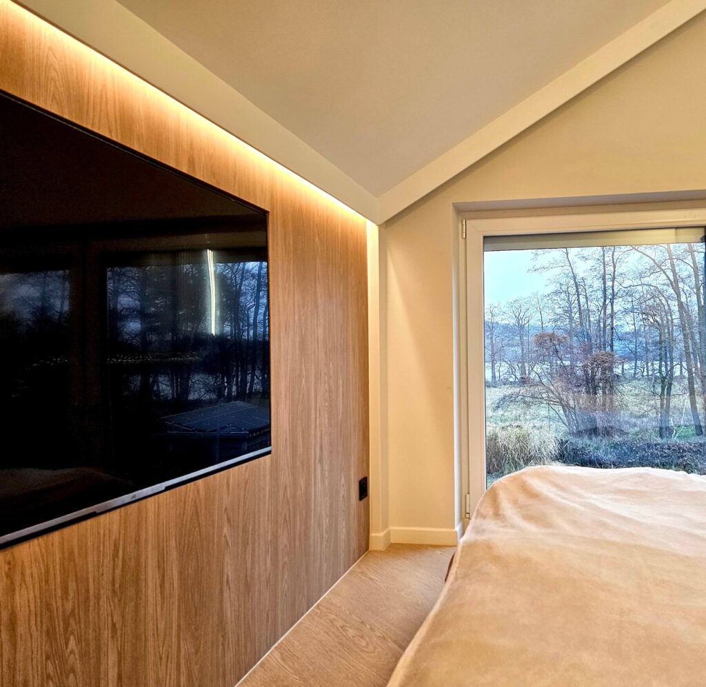 Ten wyjątkowy dom położony w Jeziorach Małych, na pięknej działce z bezpośrednim dostępem do jeziora, oferuje spektakularny widok na wodę – atut, który stał się kluczowym elementem koncepcji projektowej. Jedną z najistotniejszych zmian była wymiana przeszkleń w pokoju dziennym na większe, panoramiczne, by jak najlepiej uchwycić uroki otaczającego krajobrazu.