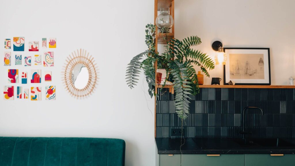 Jednym z najbardziej wyjątkowych elementów projektu jest wykończenie ścian w sypialni. Pokryto je naturalną farbą z zieloną glinką pochodzącą z Lubelszczyzny, opracowaną według autorskiej receptury ojca właściciela mieszkania, który samodzielnie wykonał gliniane tynki. Zielona glinka, znana głównie z kosmetologii, tutaj znalazła nowe zastosowanie, tworząc nietuzinkowy odcień i strukturę ścian.