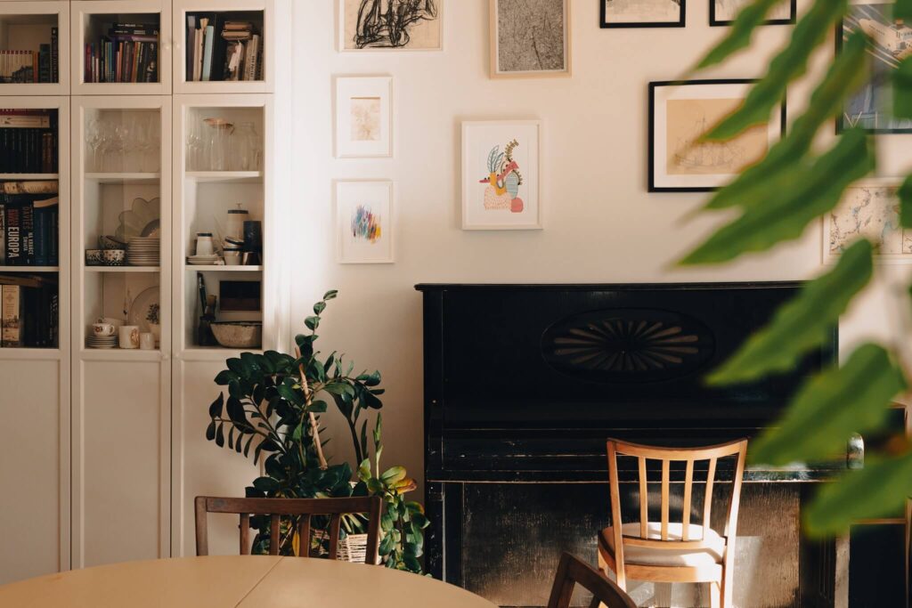 W strefie dziennej pojawiło się przedwojenne pianino. Artystyczny charakter wnętrza dopełniły grafiki na ścianach, tworząc wyjątkową, spersonalizowaną przestrzeń, idealną dla rodziny ceniącej historię, sztukę i świadome projektowanie.