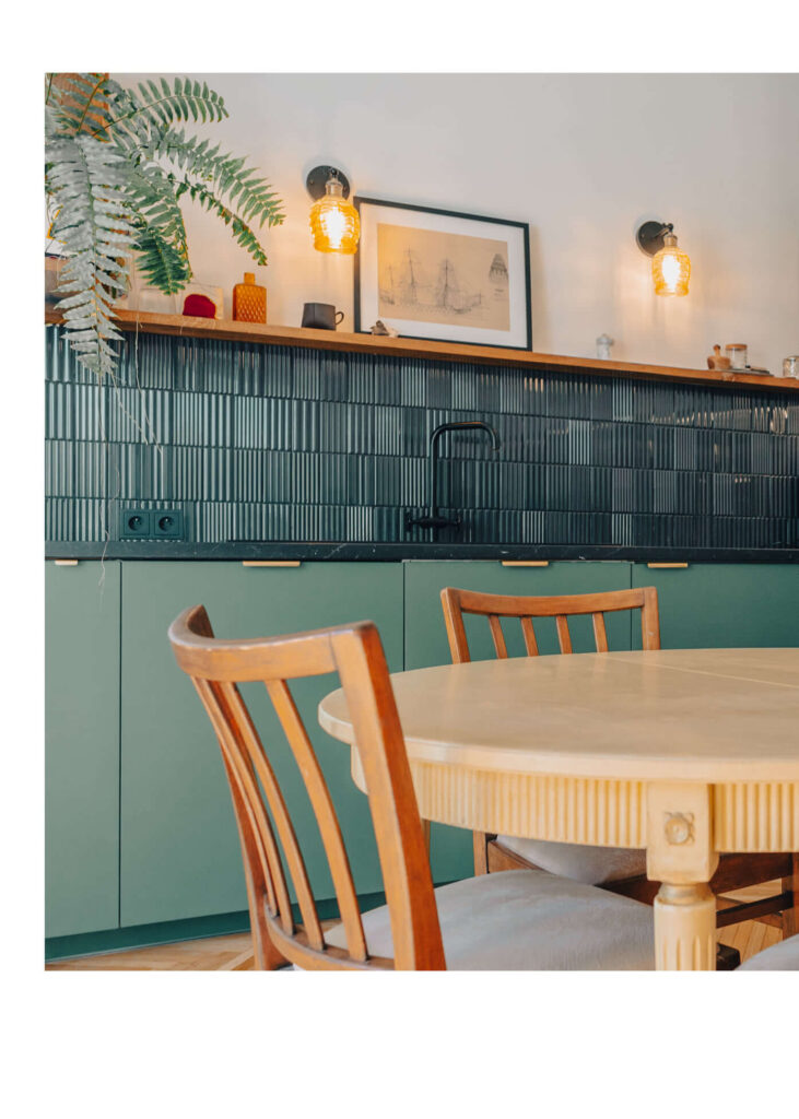Projekt utrzymany został w stylu eklektycznym, z wyraźnymi odniesieniami do estetyki vintage. Odnowiony dębowy parkiet, miejscowo uzupełniony, stał się bazą dla całej aranżacji. W przestrzeni pojawiły się również starannie zachowane oryginalne meble – odrestaurowane krzesła jadalniane oraz piękny kredens z lat 50. w orzechowym fornirze, który zyskał nowe życie w korytarzu.