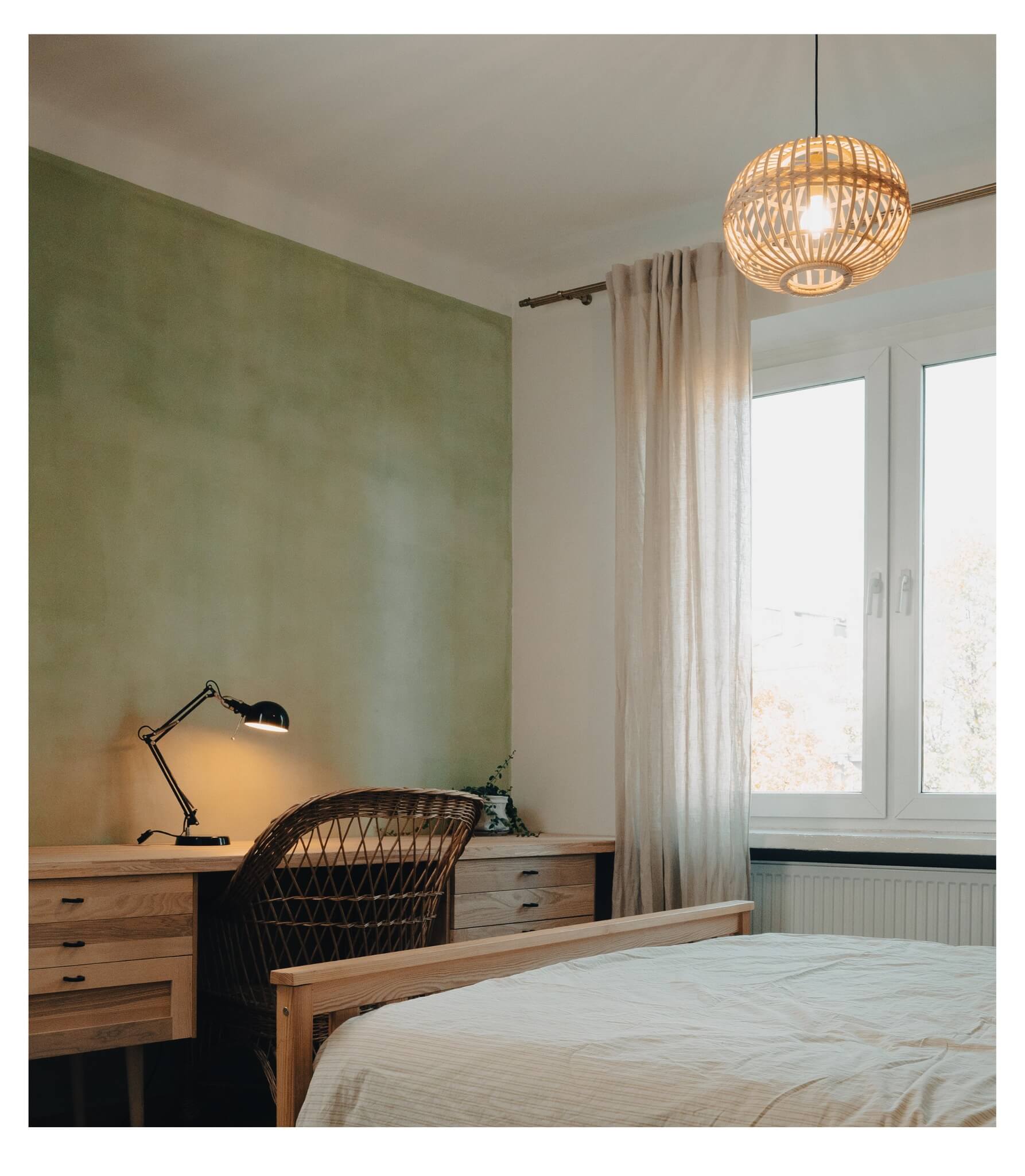Jednym z najbardziej wyjątkowych elementów projektu jest wykończenie ścian w sypialni. Pokryto je naturalną farbą z zieloną glinką pochodzącą z Lubelszczyzny, opracowaną według autorskiej receptury ojca właściciela mieszkania, który samodzielnie wykonał gliniane tynki. Zielona glinka, znana głównie z kosmetologii, tutaj znalazła nowe zastosowanie, tworząc nietuzinkowy odcień i strukturę ścian.